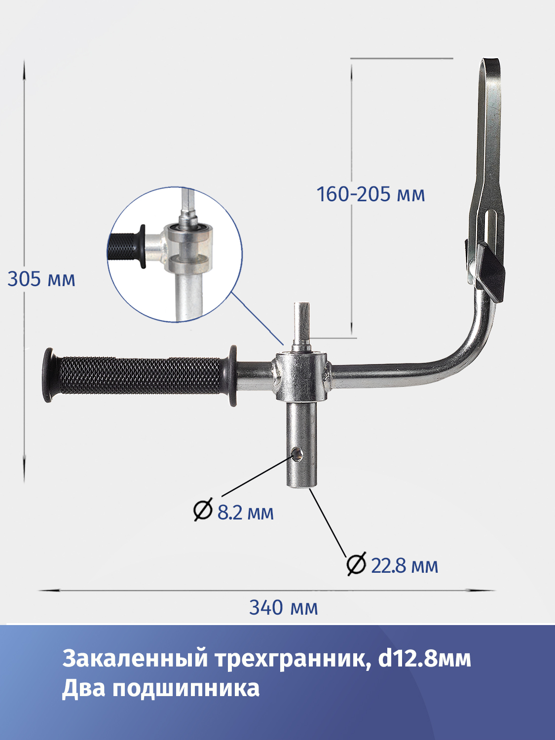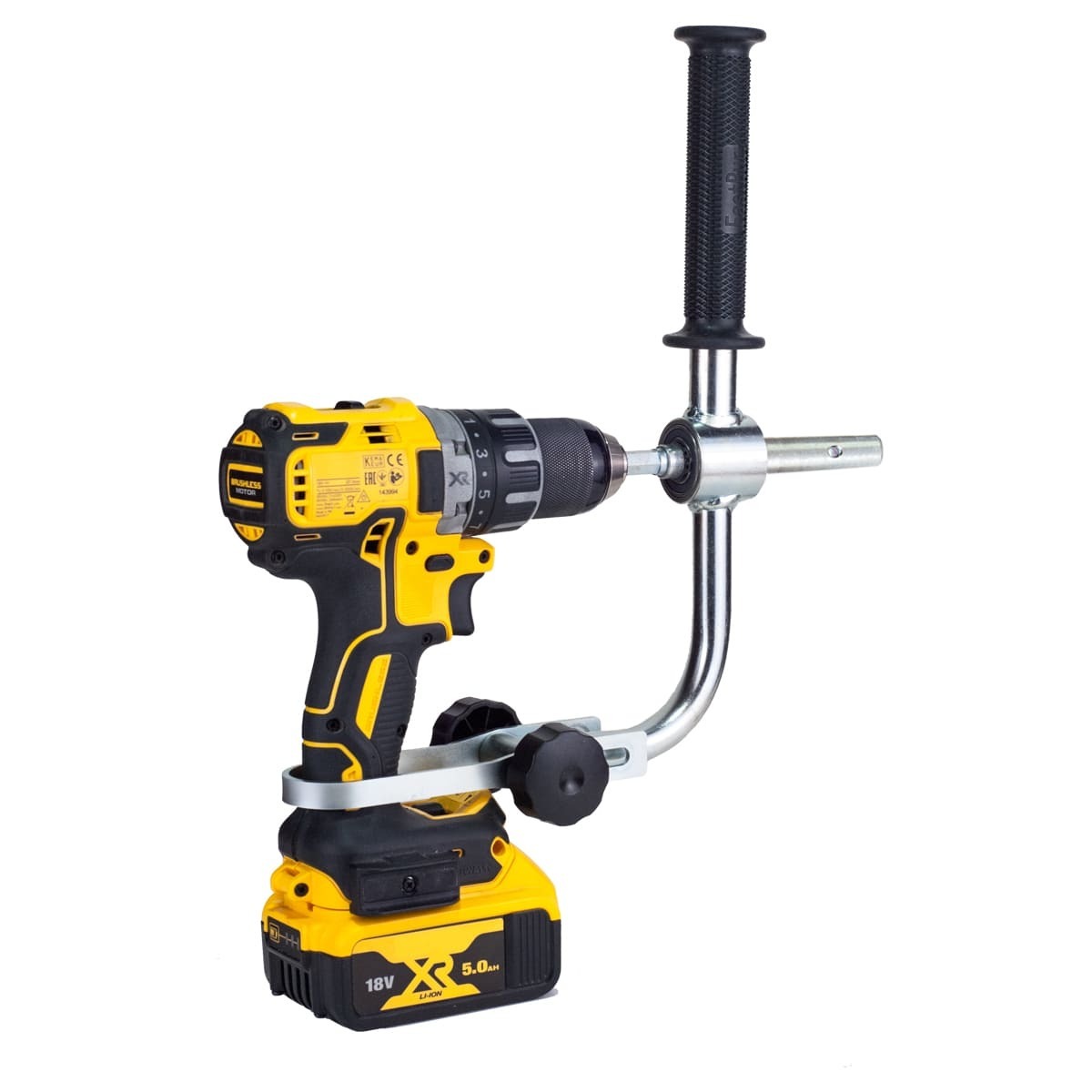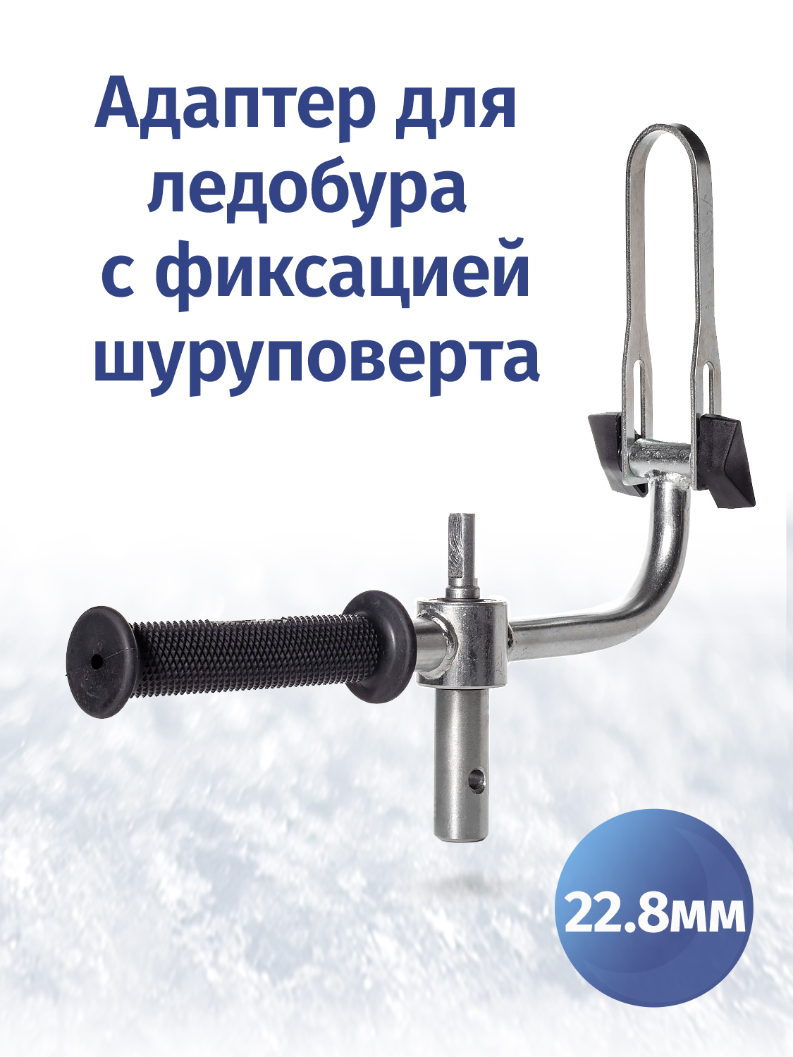 Для фиксации шуроповерта используется скоба из оцинкованной стали, там образом, получается жесткая конструкция, которая предотвращает выкручивание рук при заклинивании ледобура. Регулировка длины скобы позволяет использовать данный адаптер с большинством популярных среди рыболовов шуруповертов.