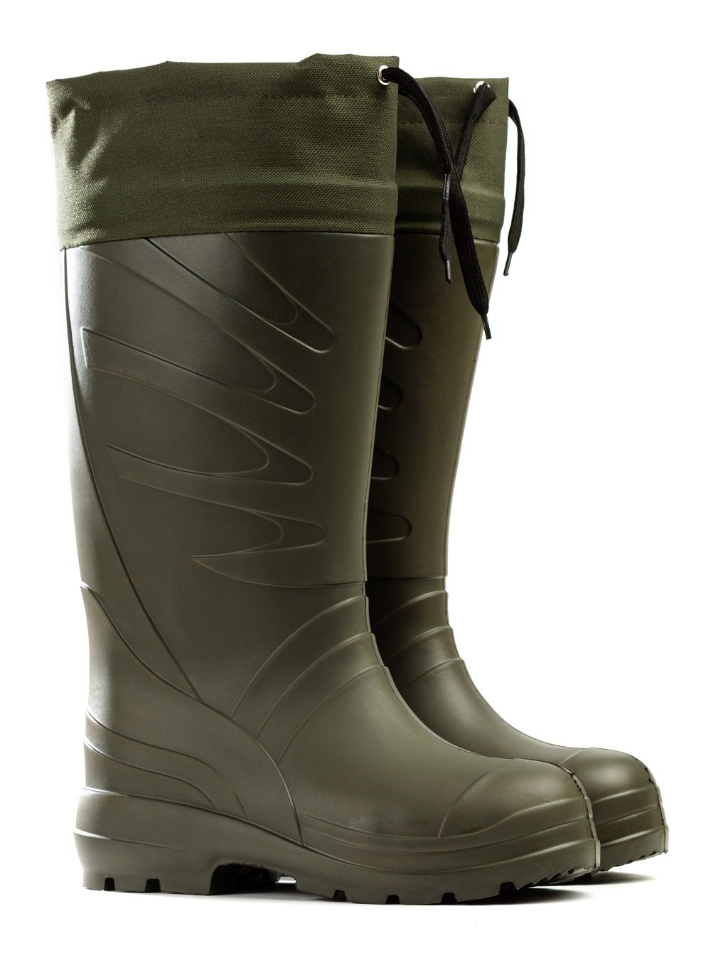 Сапоги из ЭВА полимера, верх обуви ЭВА, подошва ЭВА, метод крепления цельнолитой, клапан-манжет из ткани "оксфорд" с возможностью регулировки по ноге. Сменный вкладыш(чулок) из нетканого полотна однослойный.