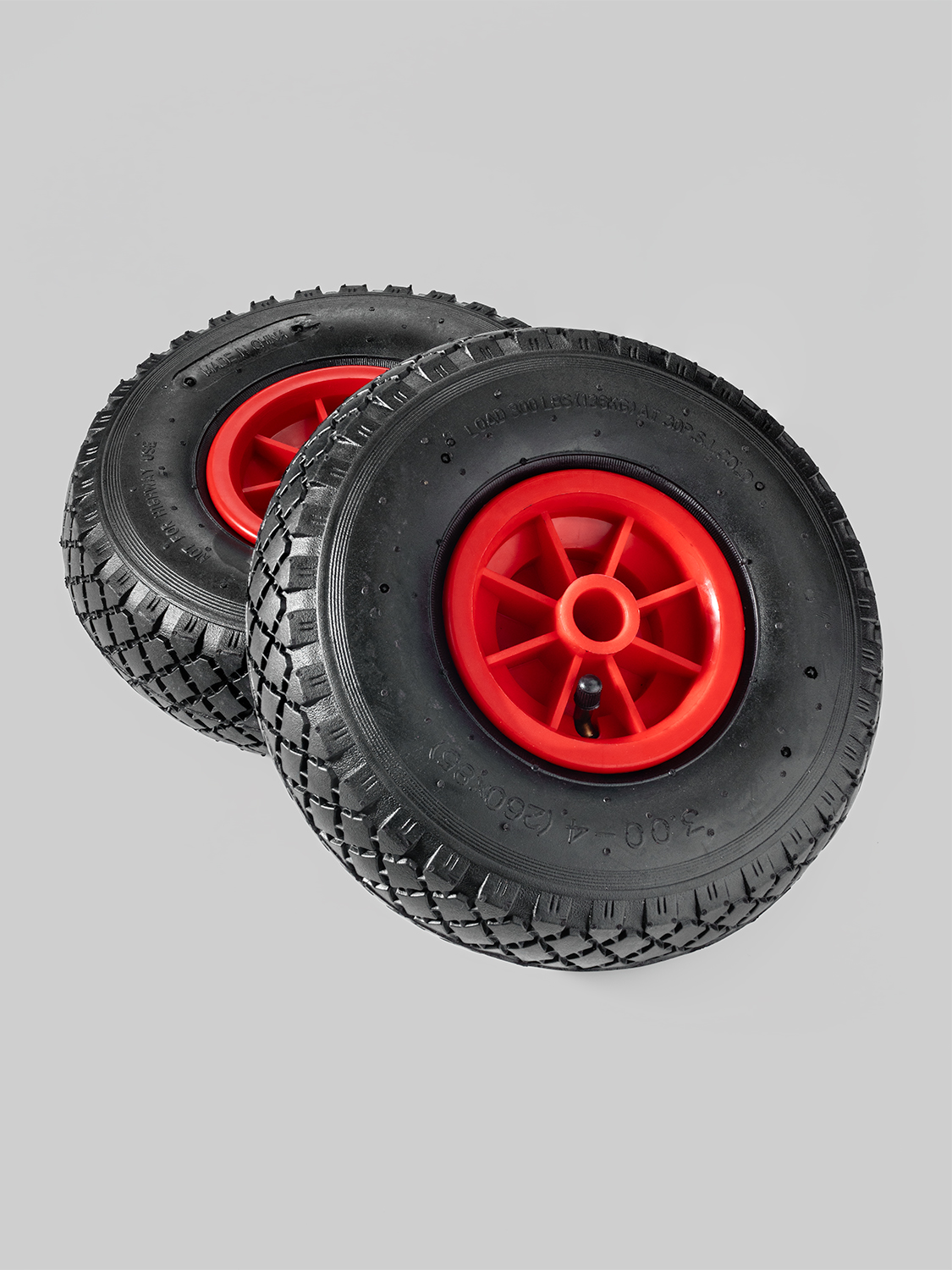 Комплект пневматических колес (с камерой) предназначен для транцевых колес ПВХ лодок, тачек, тележек. Особенность данного типа колес: способность пружинить и амортизировать на неровностях. Материал обода - пластик устойчив к коррозии и воздействию воды, что продлевает срок службы изделия.