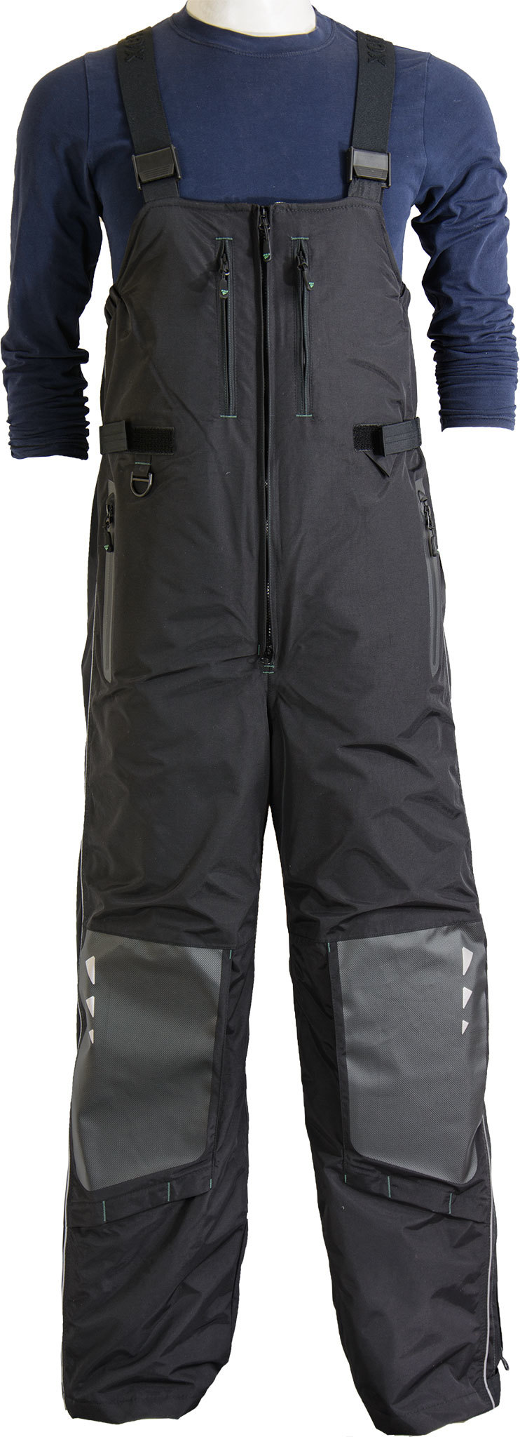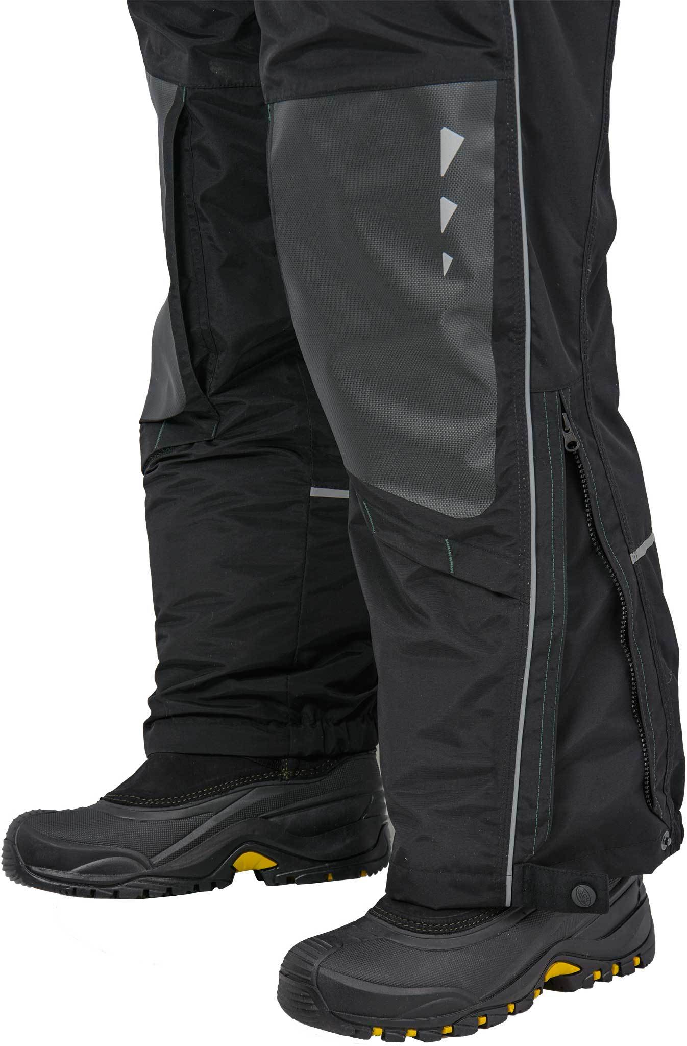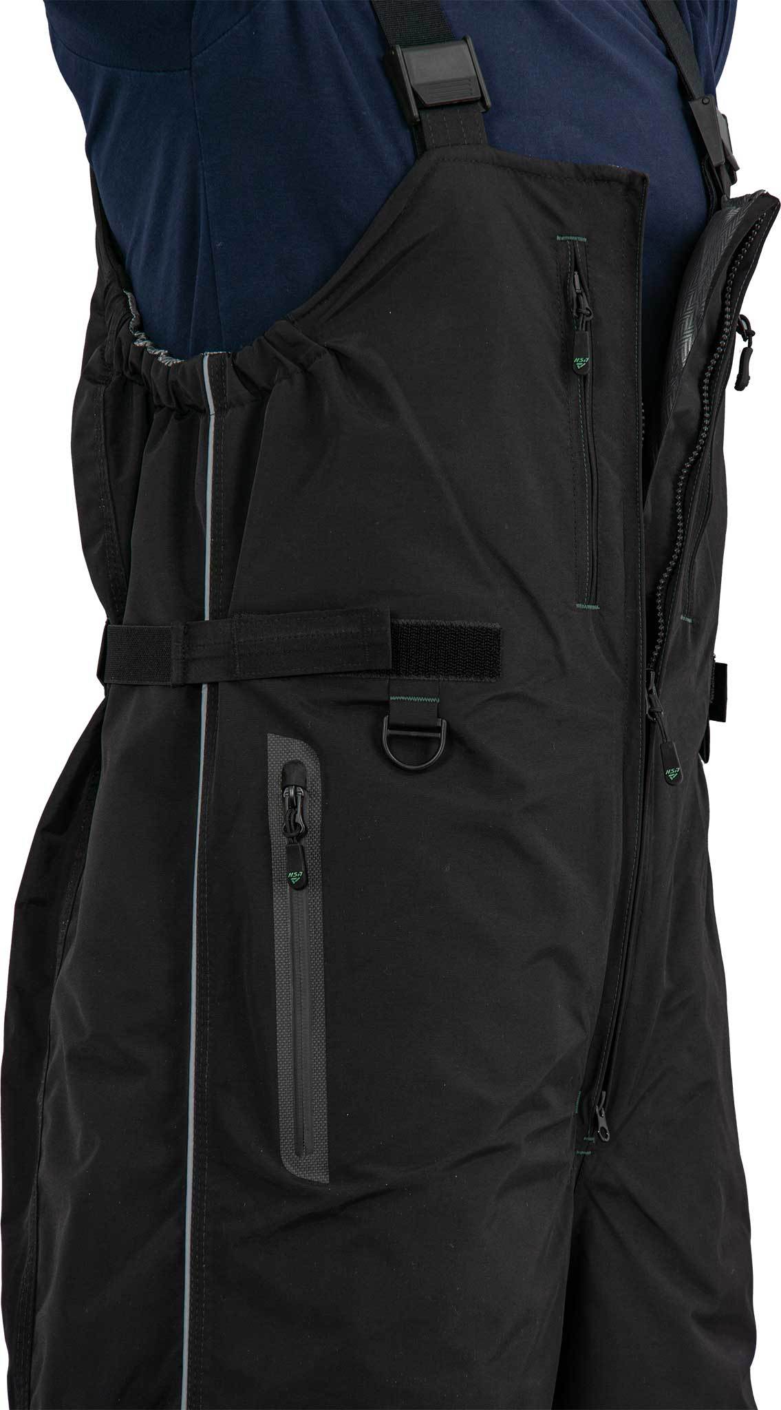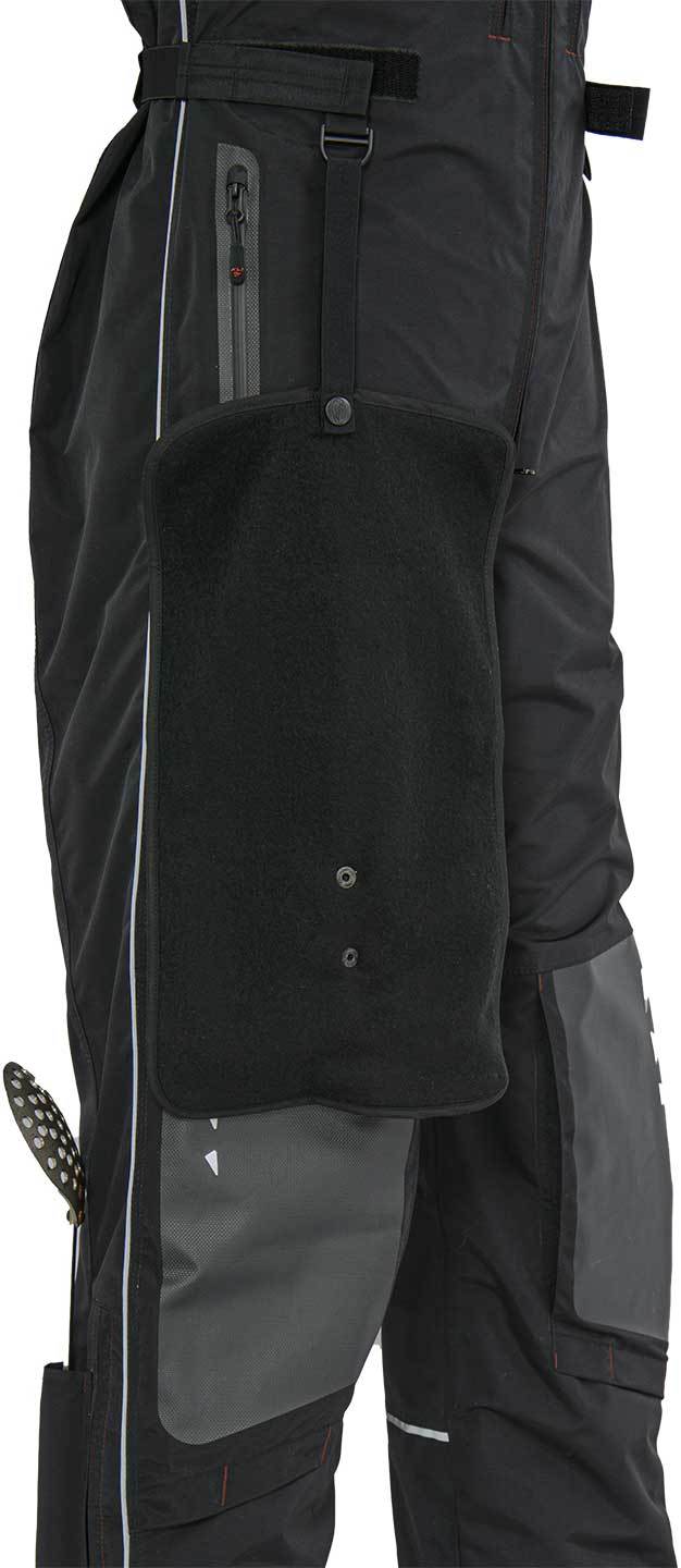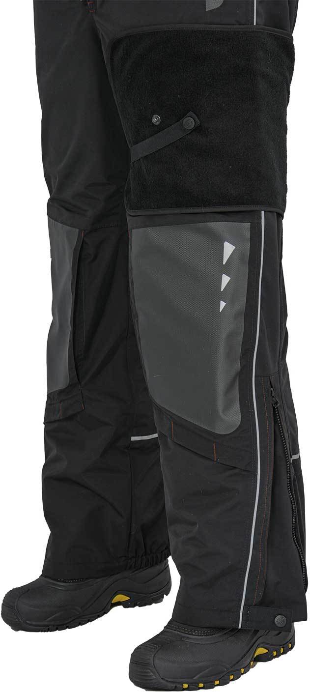 Теплый и высокий полукомбинезоне имеет специальные съемные вставки из ППЭ в наколенниках. Наколенники дополнительно усилены прочной термоустойчивой пленкой Protectfilm австрийского производства. Низ штанин на ткани внутри полукомбинезона имеет перфорацию для быстрого стекания воды.