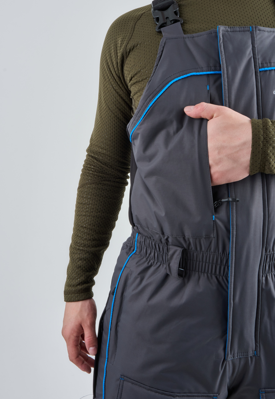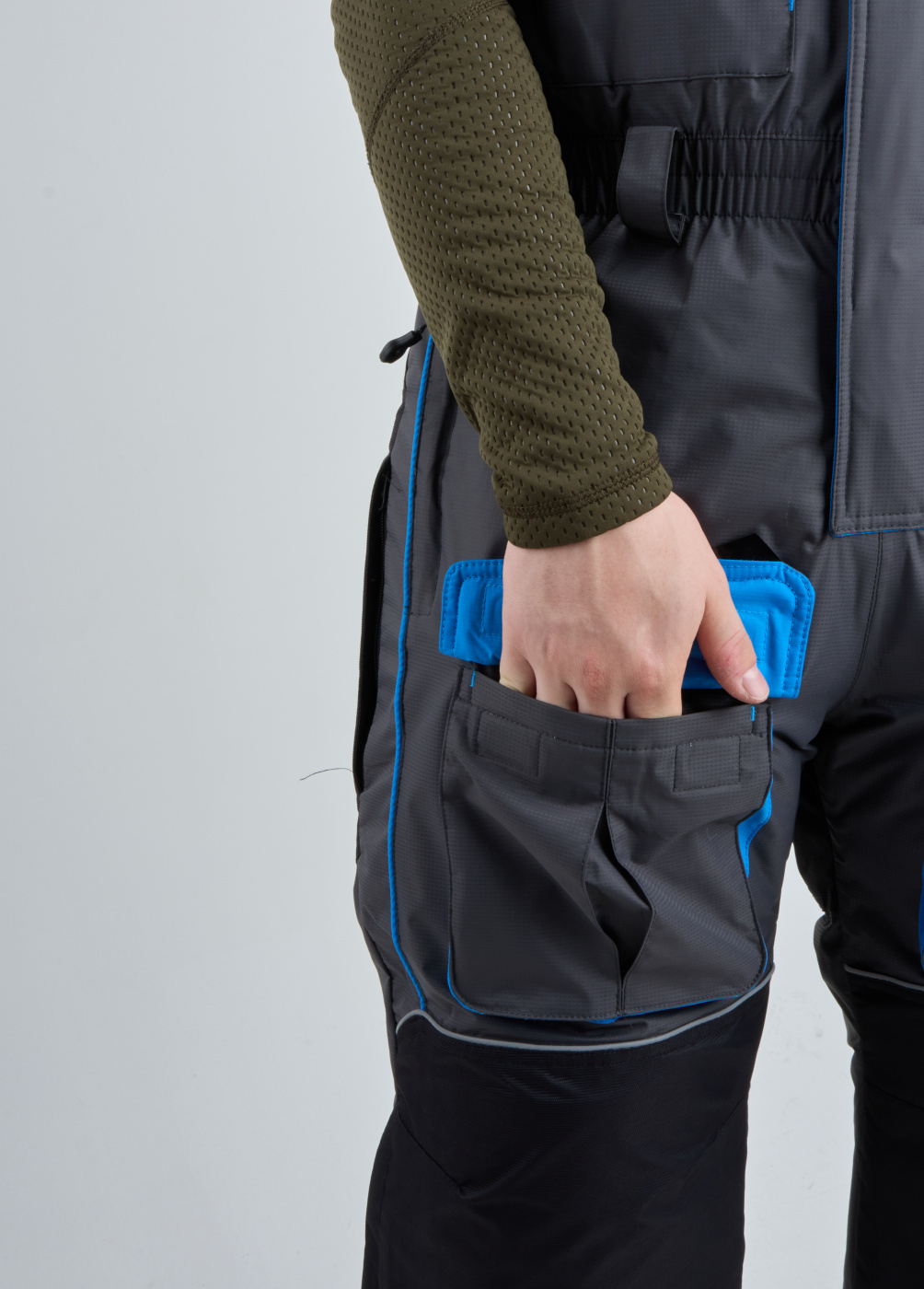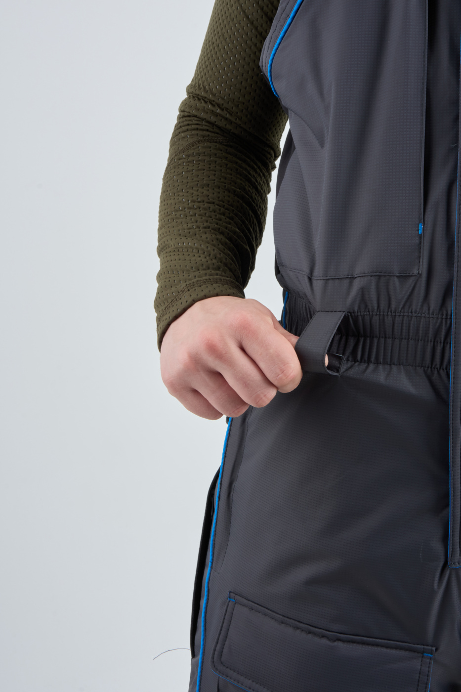 Куртки с большим количеством вместительных карманов и прочным капюшоном с козырьком. Низ рукавов на липучке. Брюки на регулируемых лямках, по низу утянуты резинками.