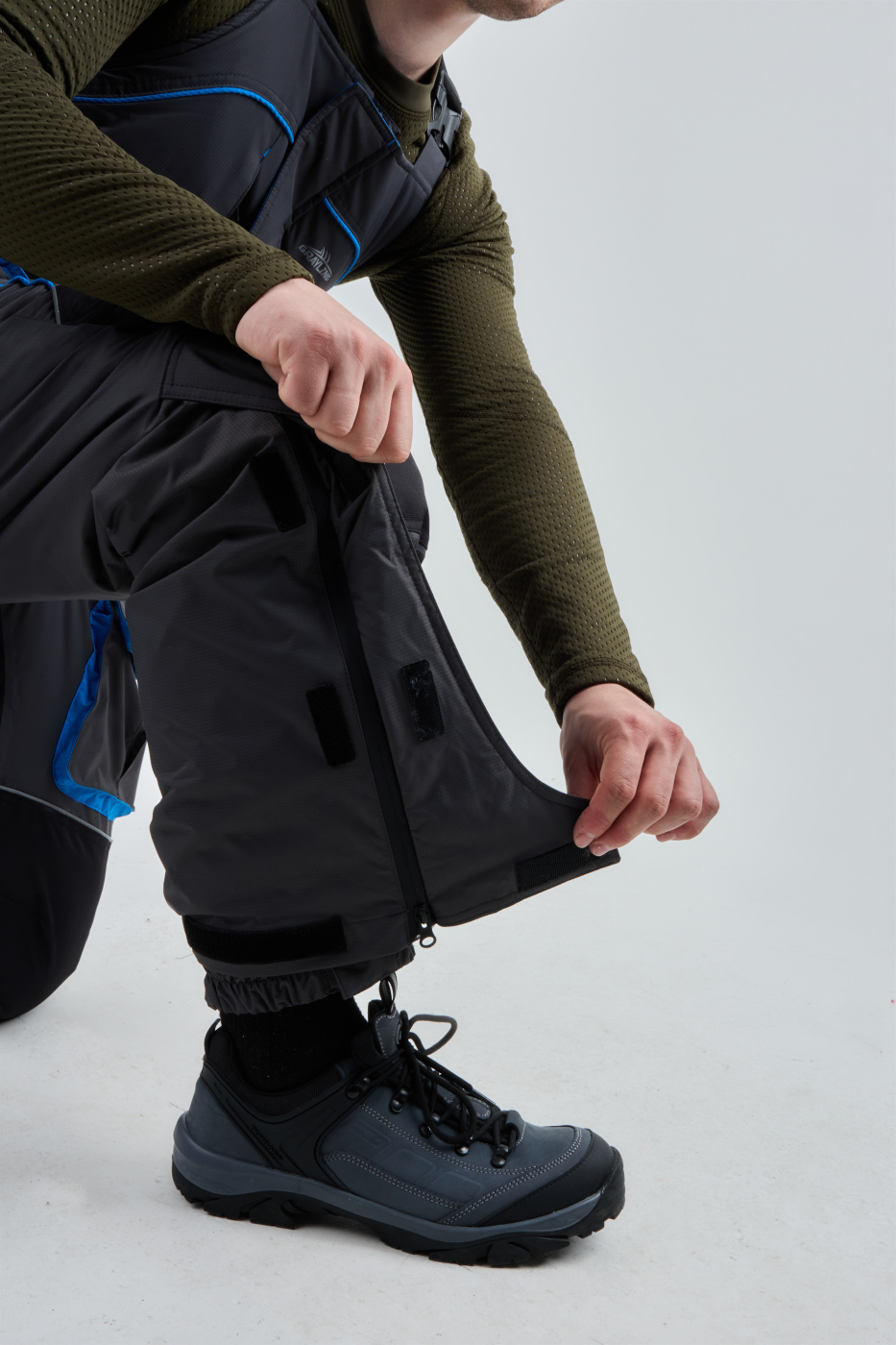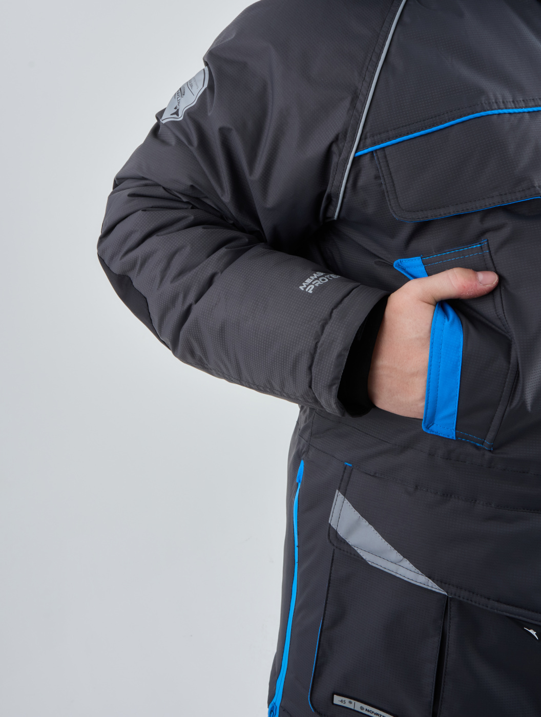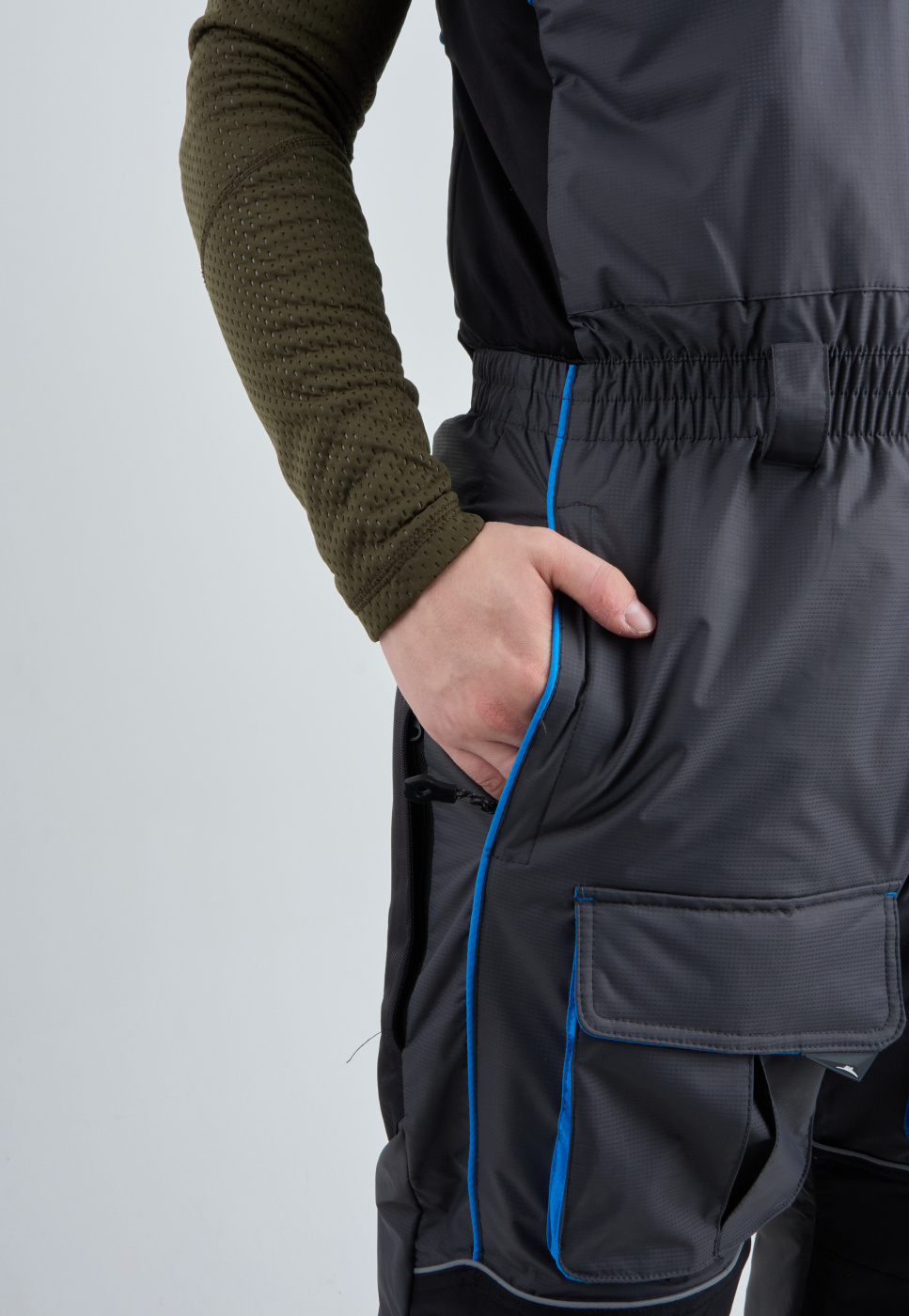 Куртки с большим количеством вместительных карманов и прочным капюшоном с козырьком. Низ рукавов на липучке. Брюки на регулируемых лямках, по низу утянуты резинками.