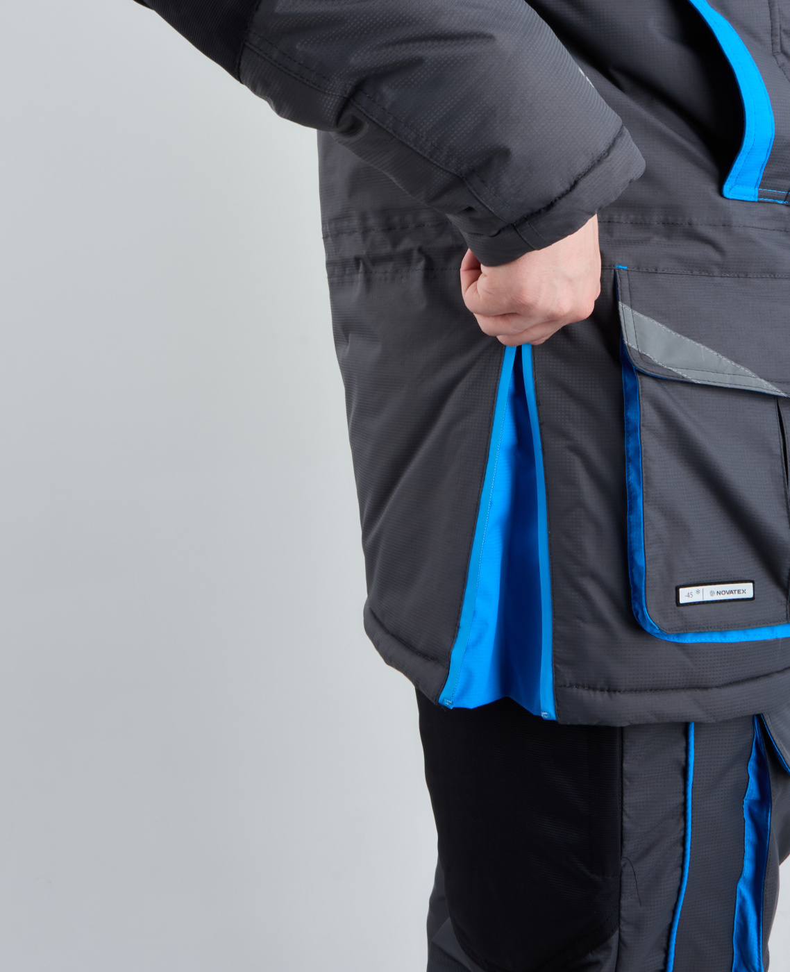 Благодаря использованию мембранной ткани костюм не продувается и не промокает. Для усиления локти, зона сидения и колени отделана особо прочной тканью «кошачий глаз».