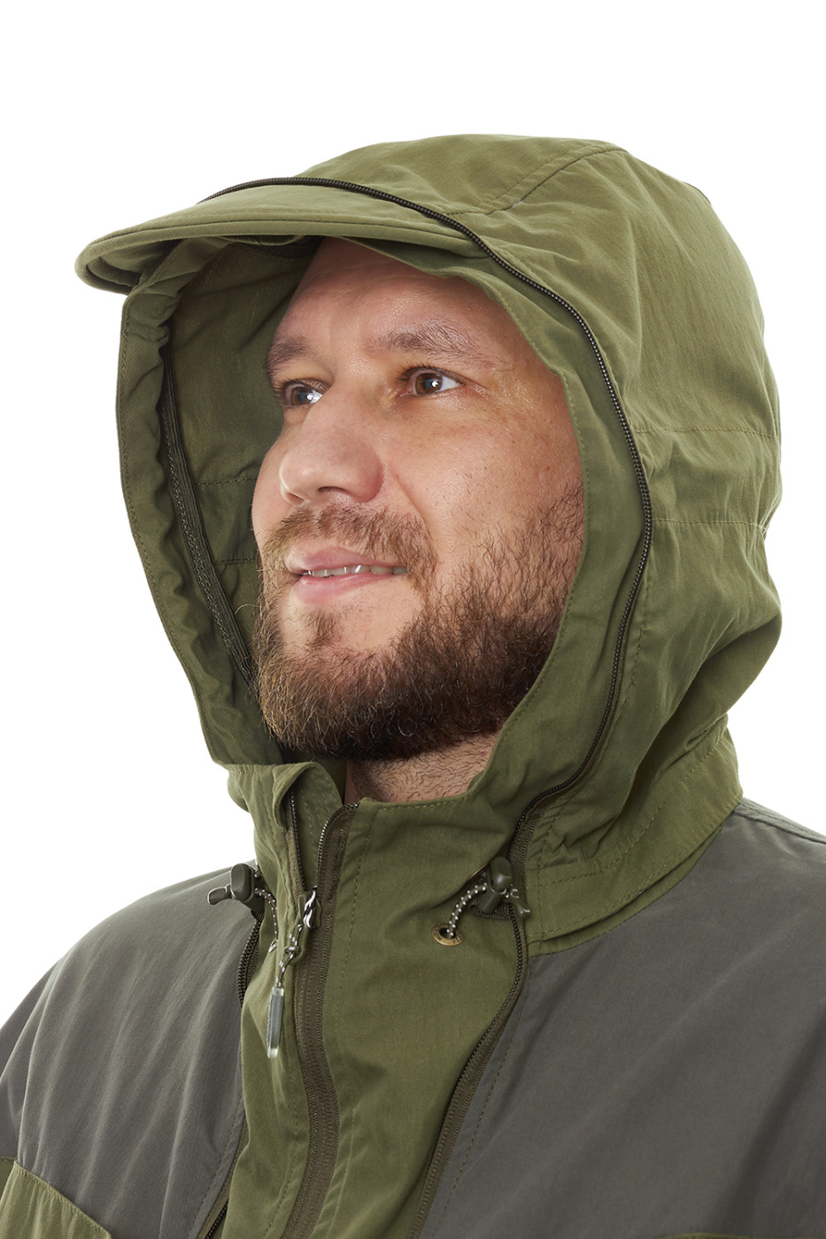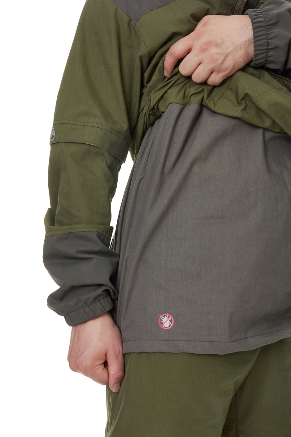 Костюм «Элит-Барьер» разработан на основе классического противоэнцефалитного костюма, который состоит из куртки типа «анорак» с капюшоном и брюк прямого кроя. Костюм оснащен специальными ловушками для клещей, внутри куртки предусмотрен дополнительный слой хлопковой трикотажной ткани, которая заправляется в брюки для максимальной защиты от проникновения внутрь изделия. Рукава оснащены плотными трикотажными манжетами. На капюшоне предусмотрена молния для противомоскитной сетки, которая компактно укладывается в карман на груди. В передней части куртки предусмотрен объемный передний влагозащитный карман и два боковых. Этот костюм отлично подойдет для всех, кто часто и долго бывает в лесу. Для обеспечения безопасности в темное время суток вся печать на изделии является светоотражающей.