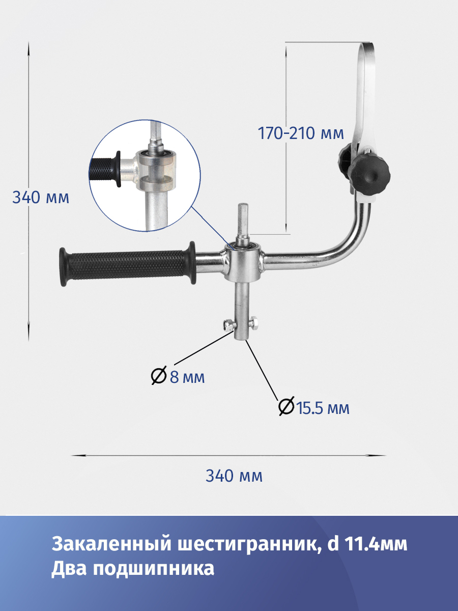 Особая геометрия рабочей площадки шнеков улучшает удаление ледяной крошки и существенно облегчает бурение. Регулировка длины скобы позволяет использовать адаптер с большинством популярных среди рыболовов шуруповертов.