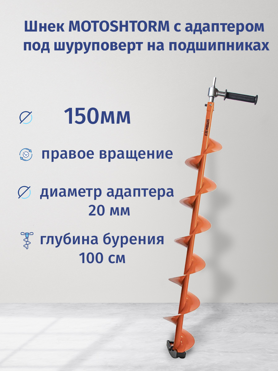 Комплект состоящий из шнека под мотобур MOTOSHTORM 150(R) (правое вращение) и адаптера под шуруповерт 20 мм с подшипником.
