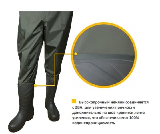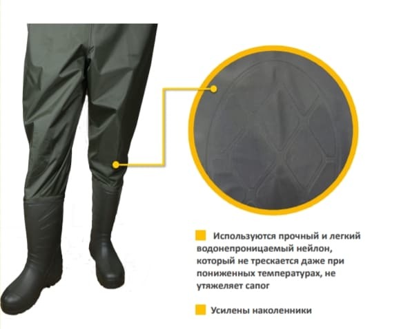 - Используются прочный и легкий водонепроницаемый нейлон, который не трескается даже при пониженных температурах, не утяжеляет сапог