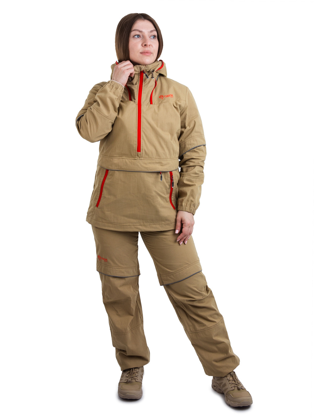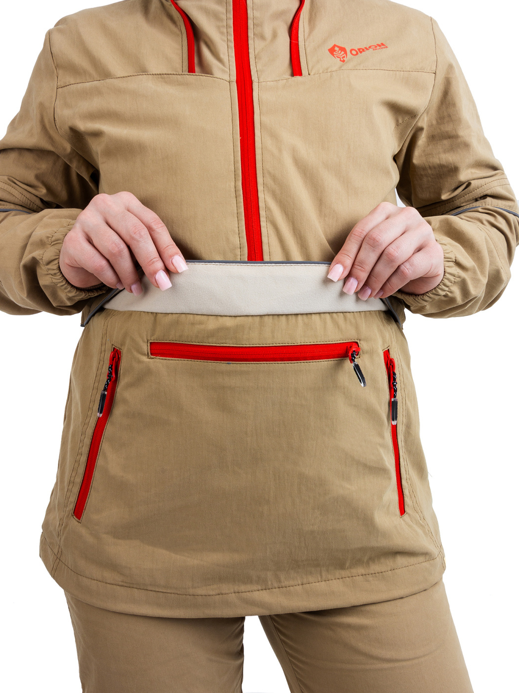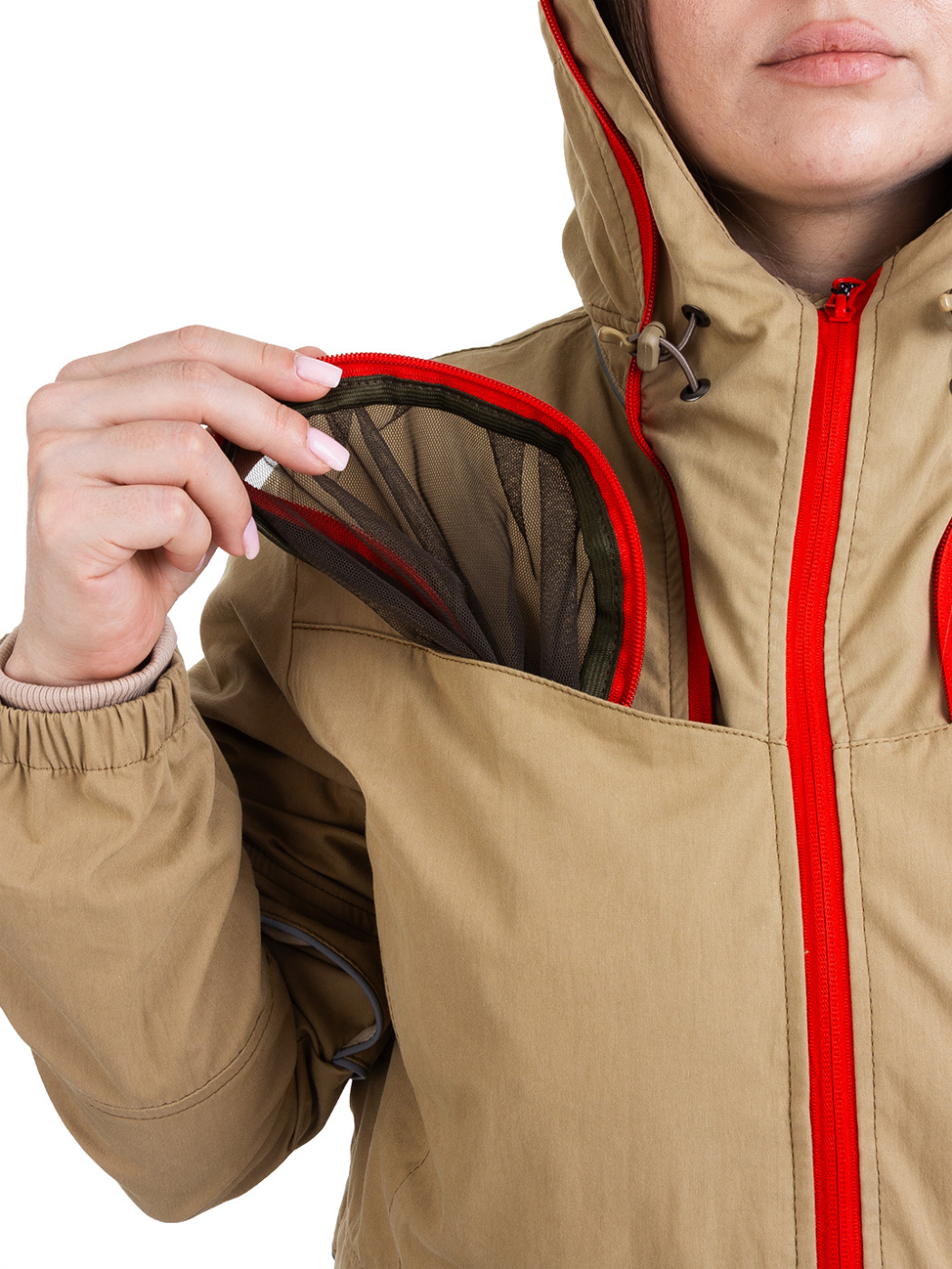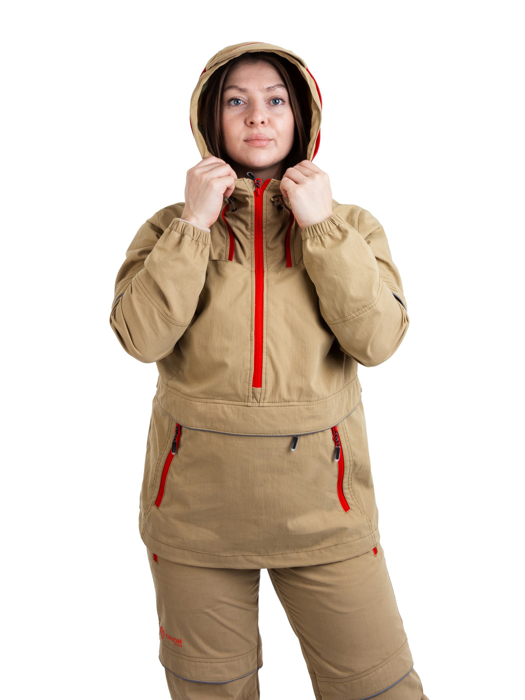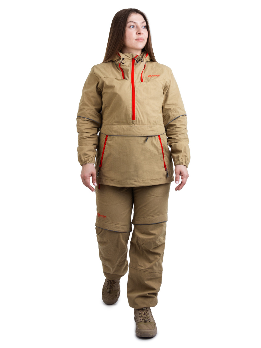 Женский костюм «Элит-Барьер» разработан на основе классического противоэнцефалитного костюма, который состоит из куртки типа «анорак» с капюшоном и брюк прямого кроя. Крой специально адаптирован под женскую фигуру. Костюм оснащен специальными ловушками для клещей, внутри куртки предусмотрен дополнительный слой хлопковой трикотажной ткани, которая заправляется в брюки для максимальной защиты от проникновения внутрь изделия. Рукава оснащены плотными трикотажными манжетами. На капюшоне предусмотрена молния для противомоскитной сетки, которая компактно укладывается в карман на груди. В передней части куртки предусмотрен объемный передний влагозащитный карман и два боковых. Этот костюм отлично подойдет для всех, кто часто и долго бывает в лесу. Для обеспечения безопасности в темное время суток вся печать на изделии является светоотражающей.